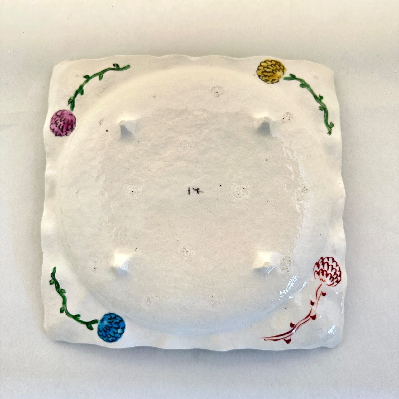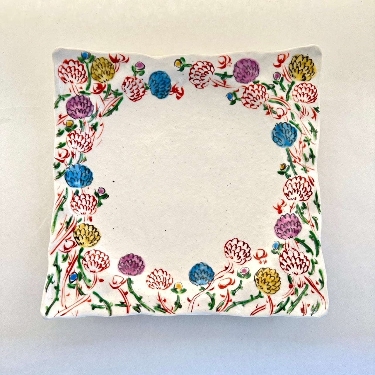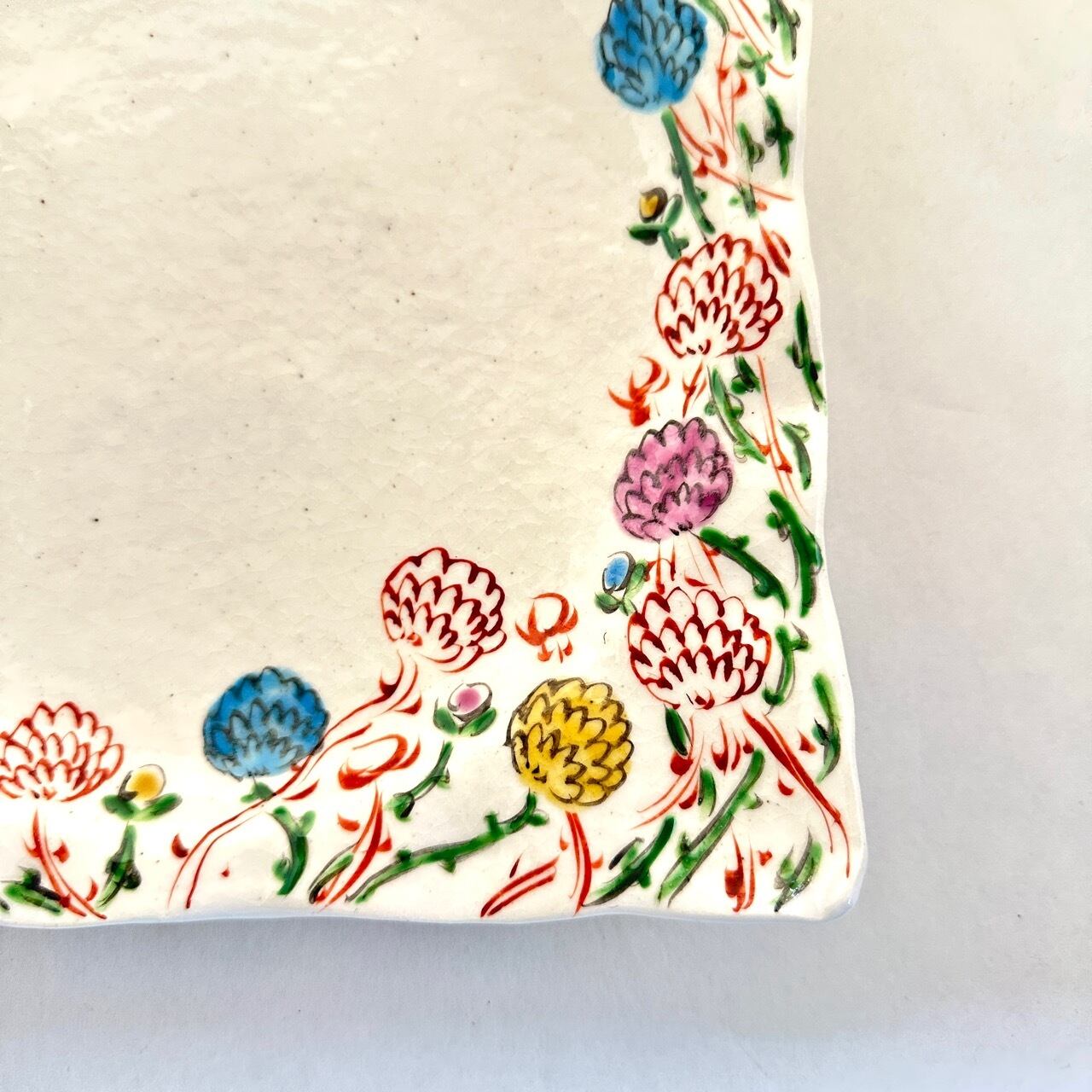 志野赤絵野花四足四方皿(大)(トルコ、黄、マロン)【榛澤宏】