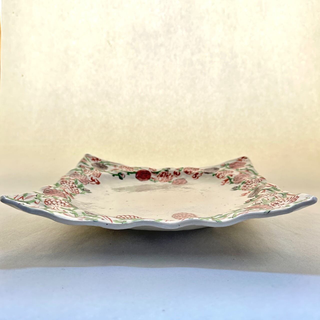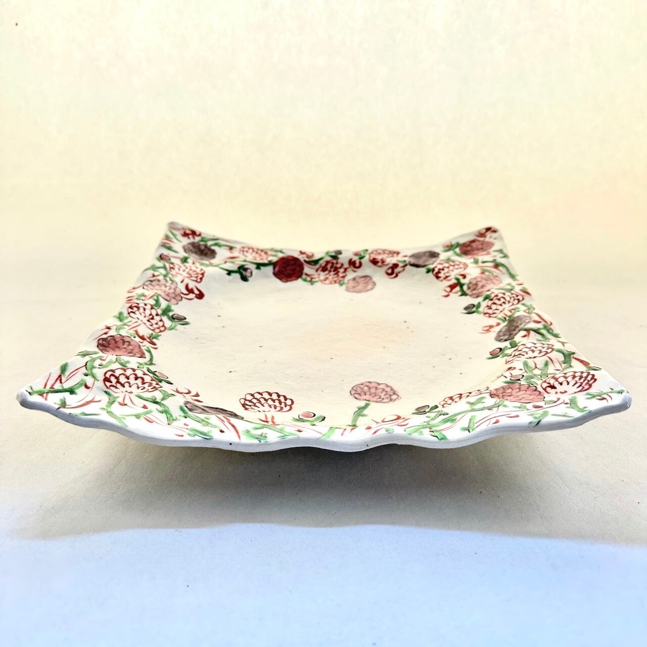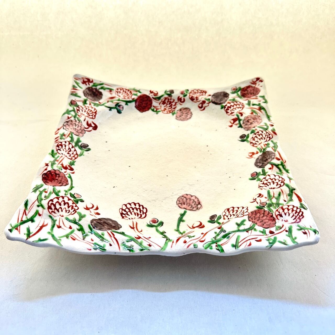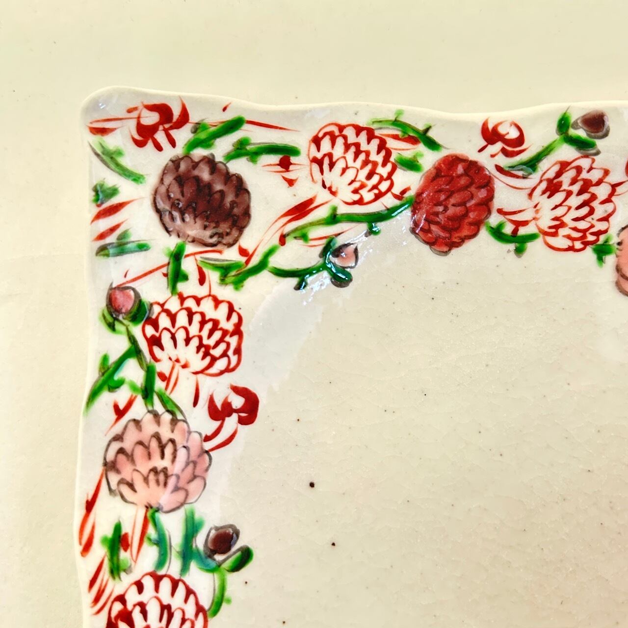 志野赤絵野花四足四方皿(大)(ピンク、紫、赤釉)【榛澤宏】
